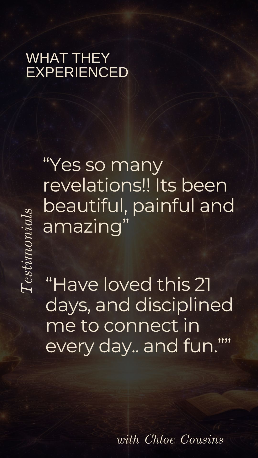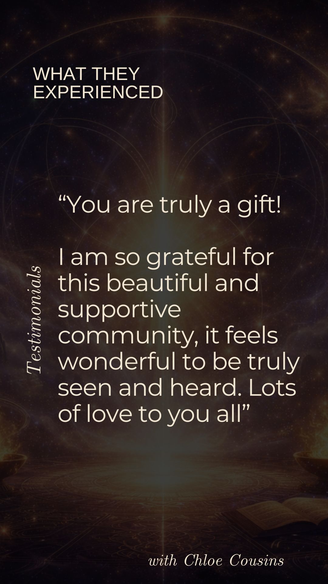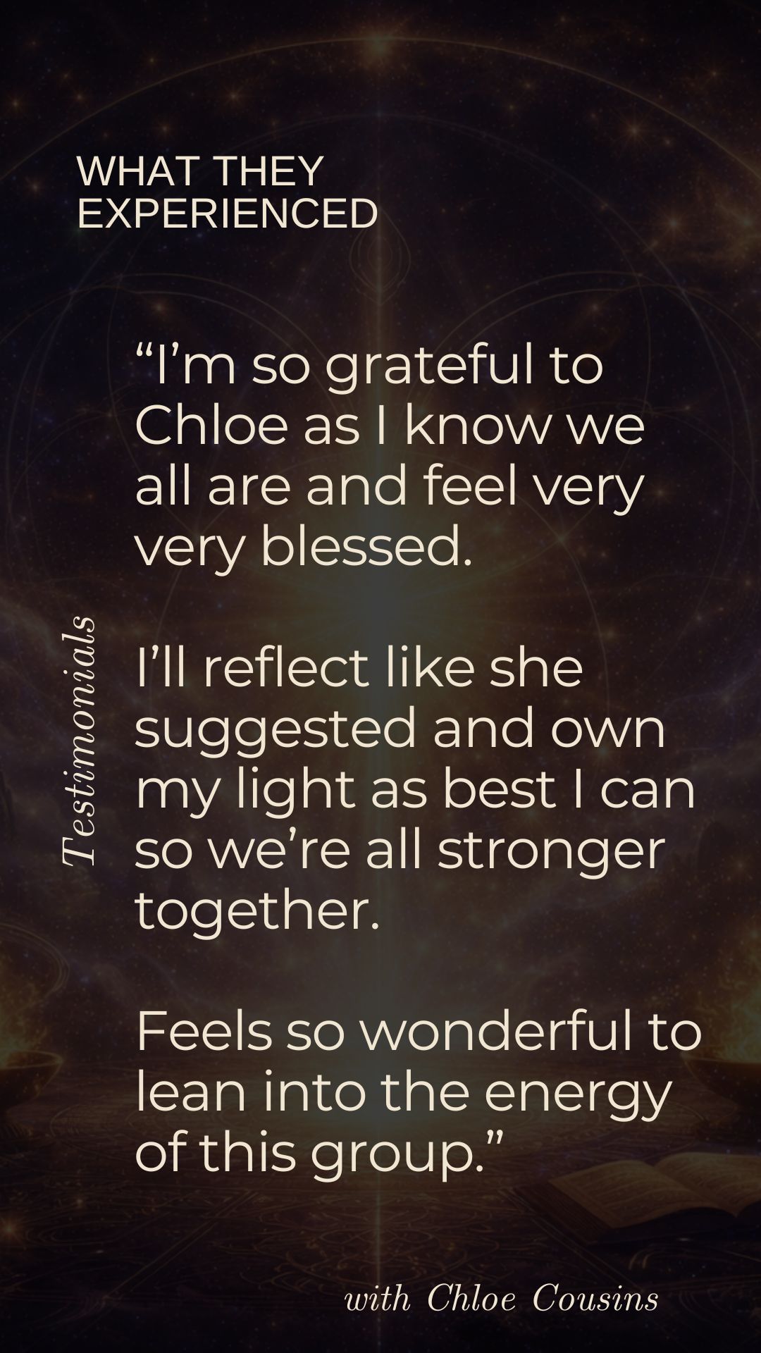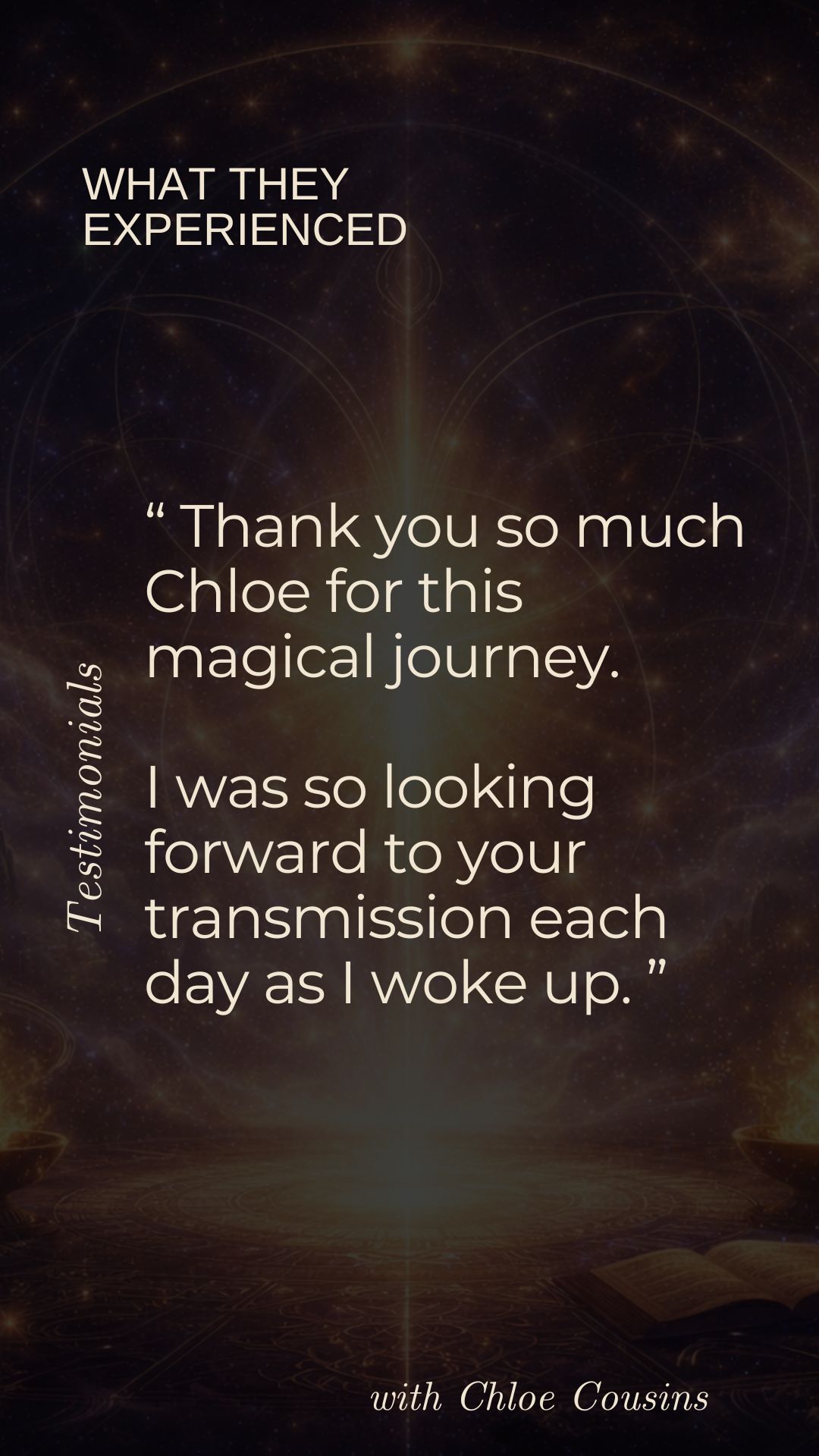 Known for translating the unseen into embodied clarity, Chloe has a rare ability to restructure and re-pattern the energetic field itself โ not only awakening remembrance of who you truly are but recalibrating your energetic architecture so that truth becomes embodied reality.